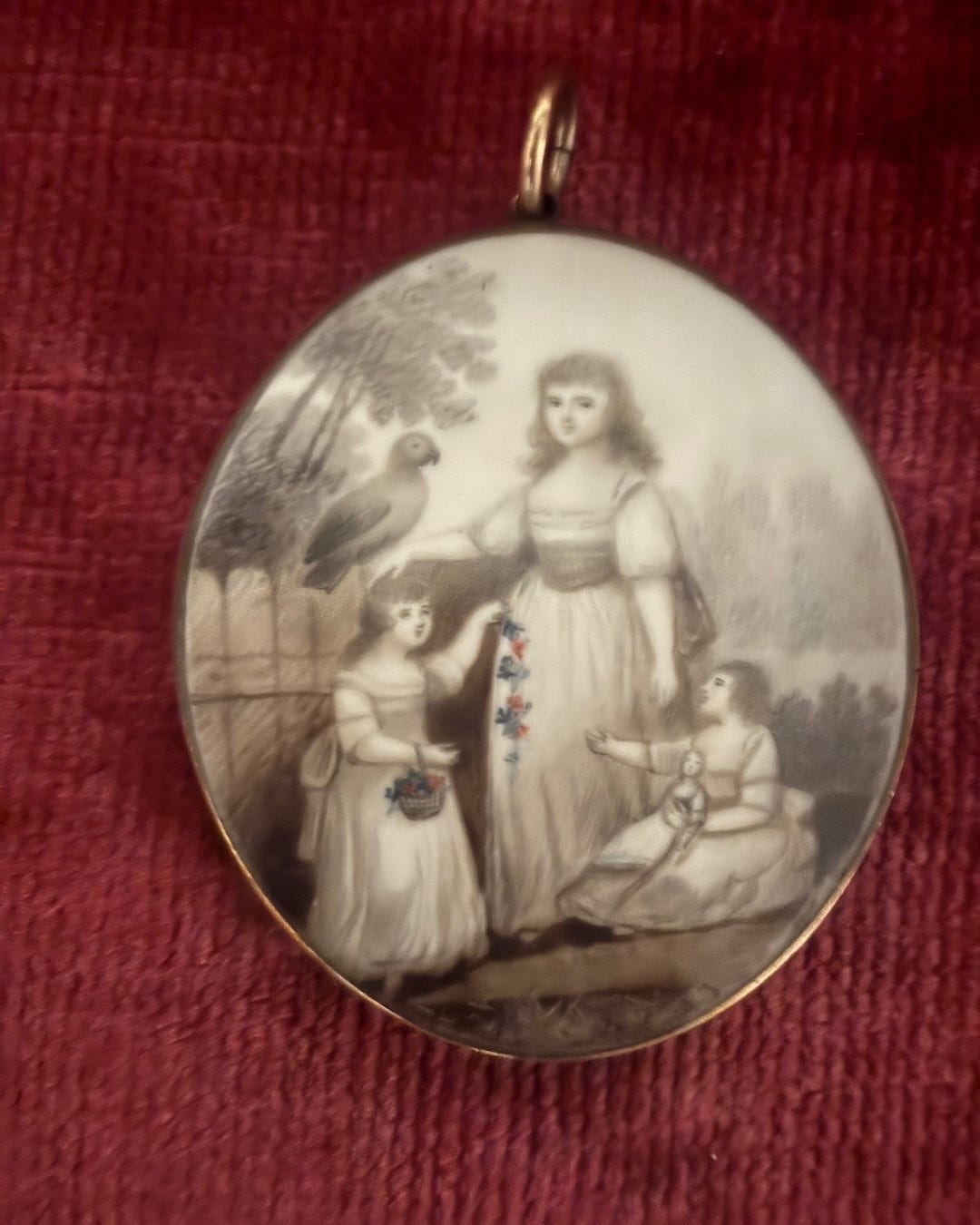 The Georgian family portrait features a mother and her two daughters. One daughter clasps her doll, her older sister dangles a string of flowers, and their mother sports a parrot on her hand, a fashionable pet for upper-class eighteenth-century households. Woven hair on the back of the pendant may memorialize the father who is missing from the painting or a deceased child.