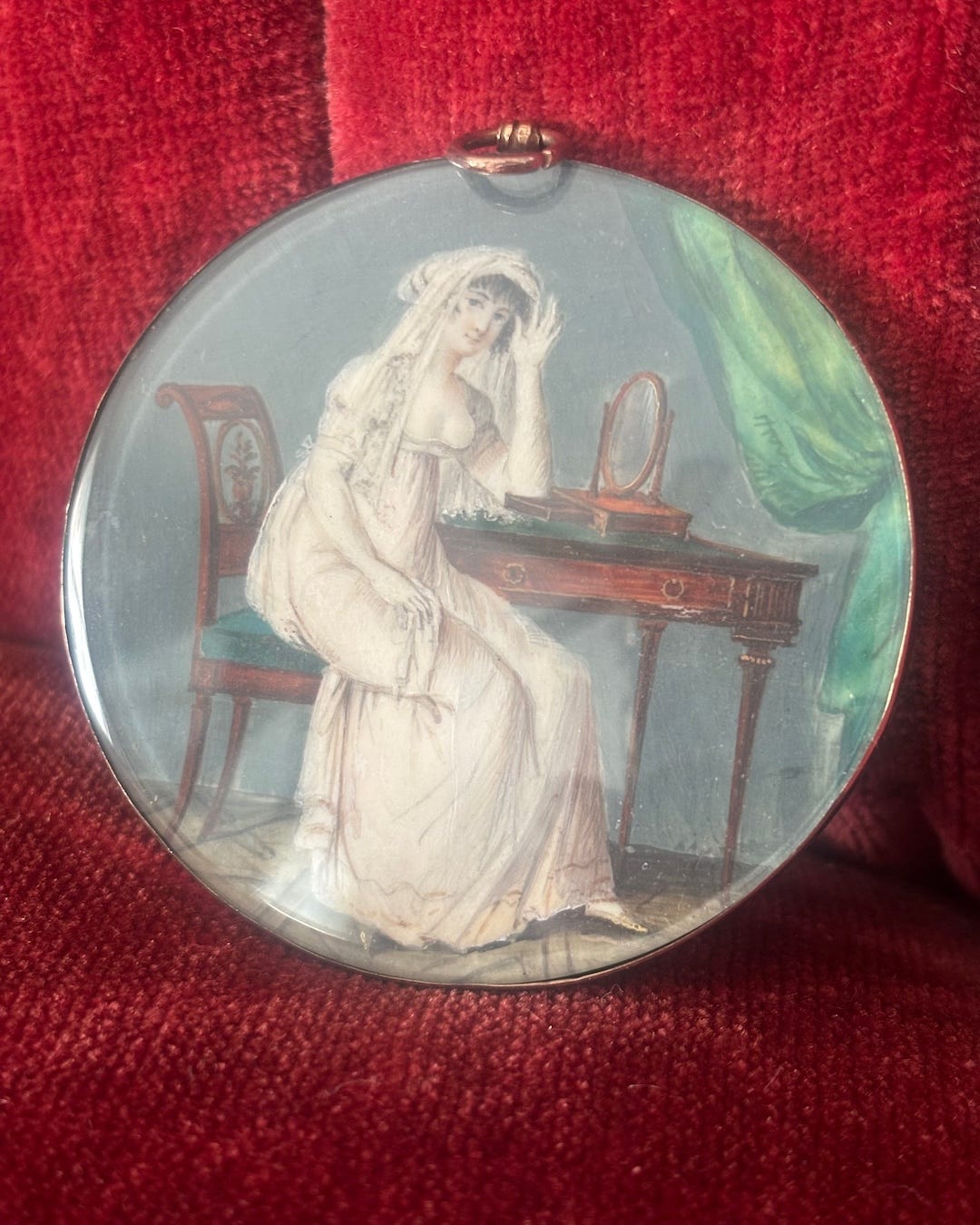 The woman from the turn of the nineteenth century sits at her dressing table and waves at the viewer. She opened the drawer of her jewelry box and spread her jewels before her. Two centuries later, her jewelry became family heirlooms worn by her modern-day descendants.